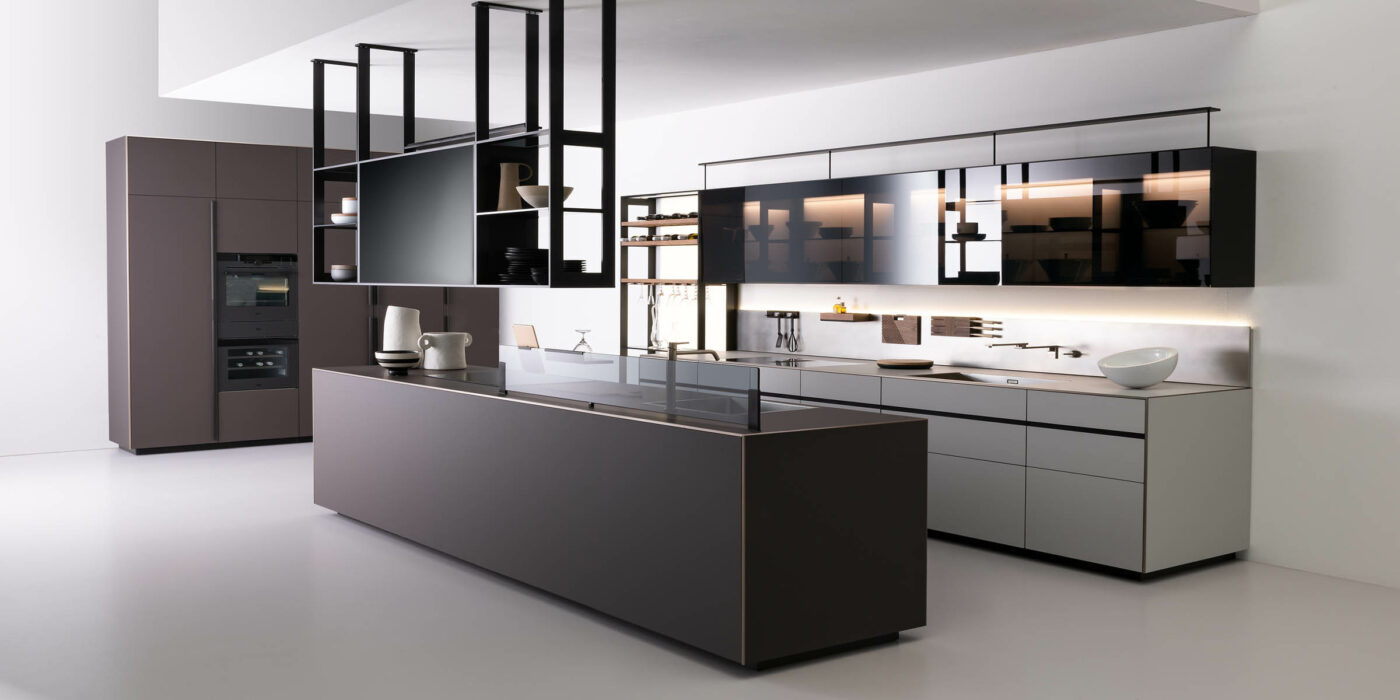 Aus der ausgefeilten Technologie von Valcucine entsteht ein geradliniges Profil, das sich an den Kanten der Küche entlangzieht und zum charakteristischen Element der neuen Riciclantica Outline wird.